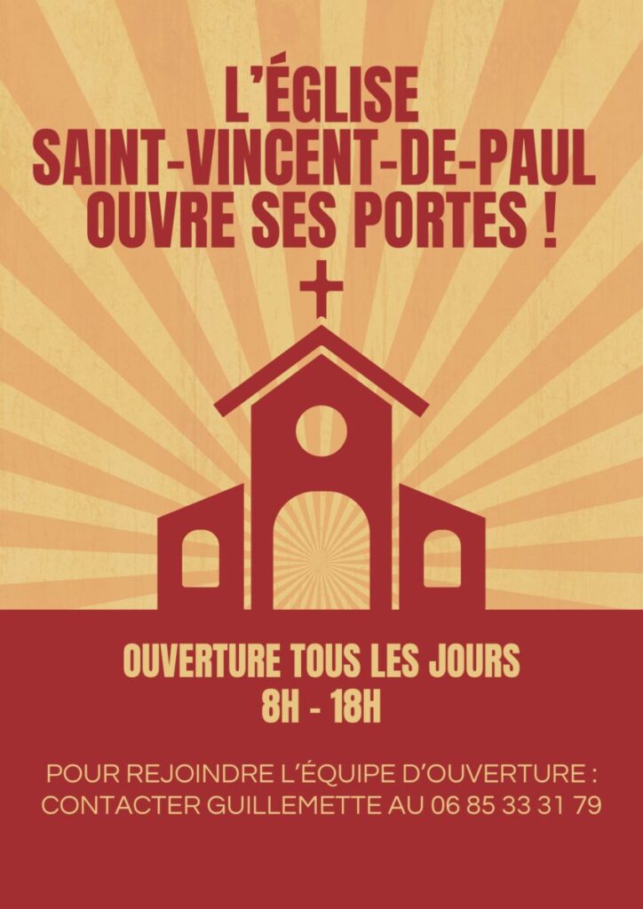 Dans la dynamique de revitalisation de la communauté chrétienne du Grand Trou, l’église St Vincent de Paul sera ouverte tous les jours de 8h à 18h . Des paroissiens se mobilisent autour de l’équipe missionnaire du Grand Trou pour mettre en oeuvre cette initiative. Guillemette Marchant, qui habite 2 rue du presbytère, va coordonner cette équipe d’ouverture et de fermeture. L’objectif de cette initiative est de proposer aux habitants du quartier un oasis de paix et de rencontre. Chacun pourra rentrer dans l’église, allumer un cierge, priez s’il le souhaite auprés de Jésus dans le Tabernalce (lumière rouge), par l’intercession de la Vierge Marie (au fond à gauche) ou encore de St Vincent de Paul (au milieu à gauche). N’hésitez pas à contacter Guillemette pour plus d’information au 06 85 33 31 79.